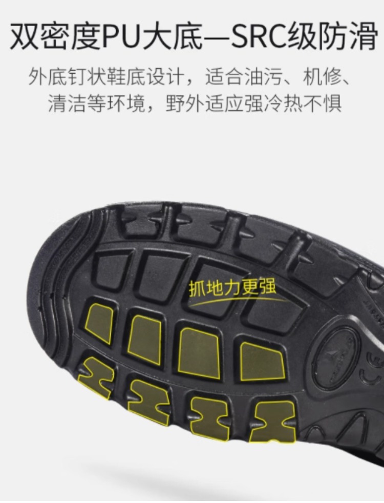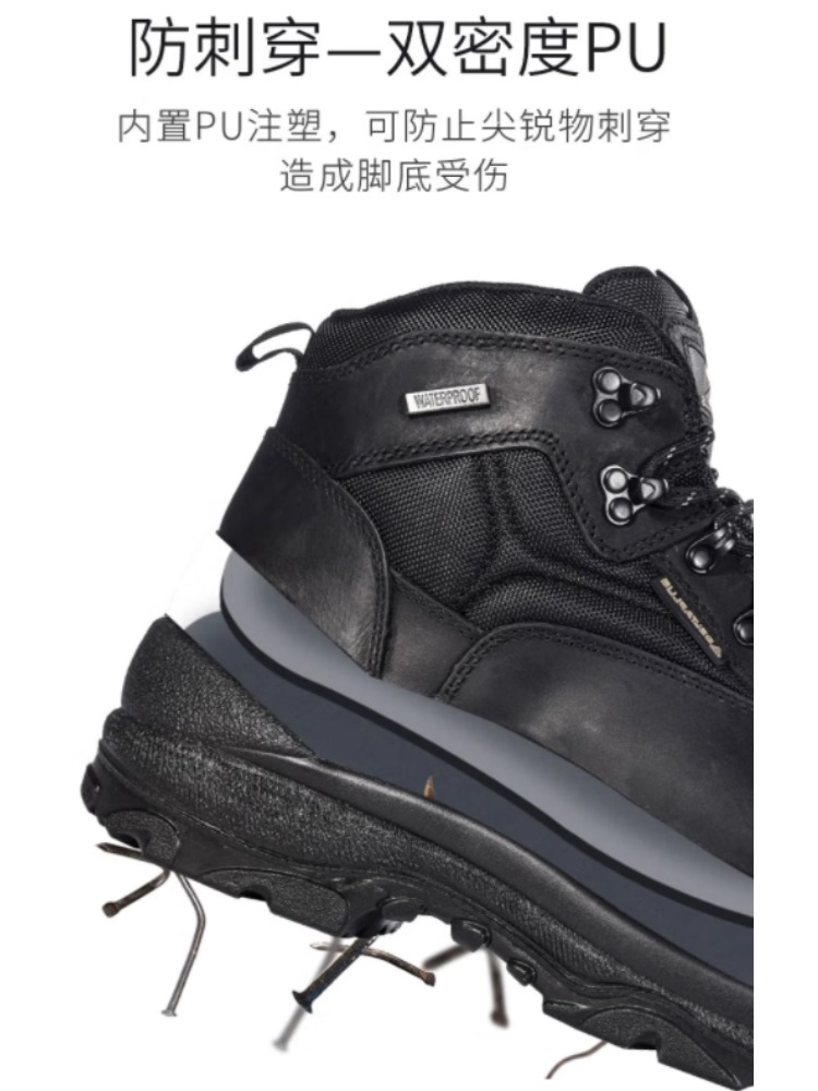 粒面牛皮防水耐脏,前端橡胶防砸防踢,内置防穿刺底板-双密度PU,防静电-柔软防滑大底。此安全鞋可以提供专业防护,用于全能环境使用室外工作(野外勘查、火灾调查)或室内作业(安检巡查)。